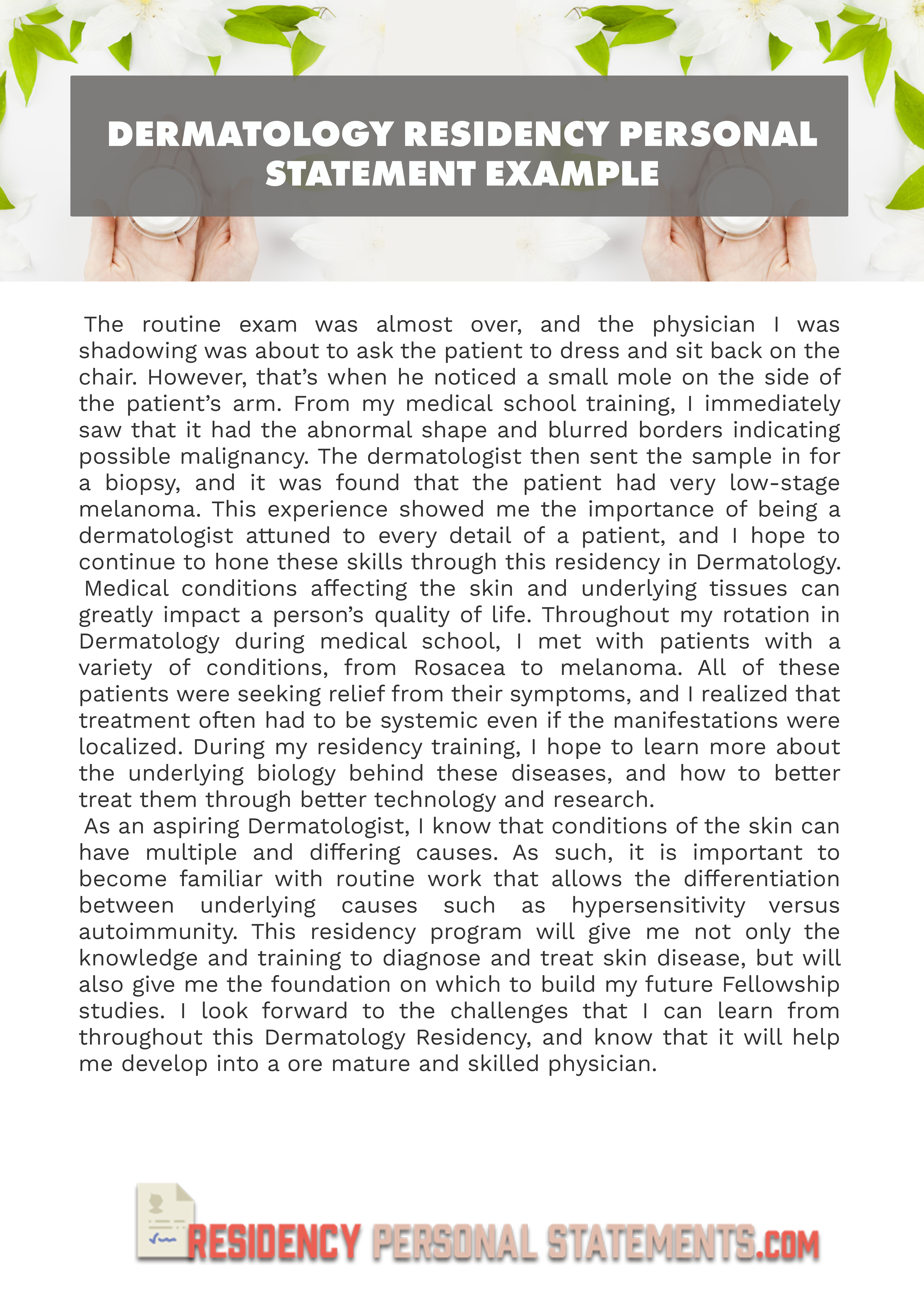 A dermatology residency personal statement, like other personal statements, has three primary requirements that each dermatology candidate must meet: writing your personal statement honestly, discussing their ambitions and future dermatology career expectations, and making sure, in a personal statement, they describe their dermatology abilities and traits relevant to the dermatology program in an interesting manner.
